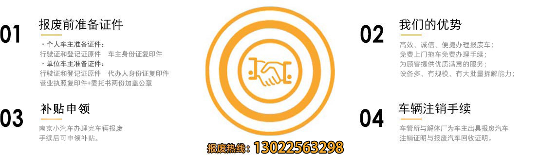 南京报废汽车拆解公司是南京市交管局指定的车辆报废回收中心。主要经营:南京报废车回收、南京回收黄标车、南京货车回收、南京回收货车、南京报废机动车回收、南京老旧车回收、南京高价收购二手车、南京异地报废。